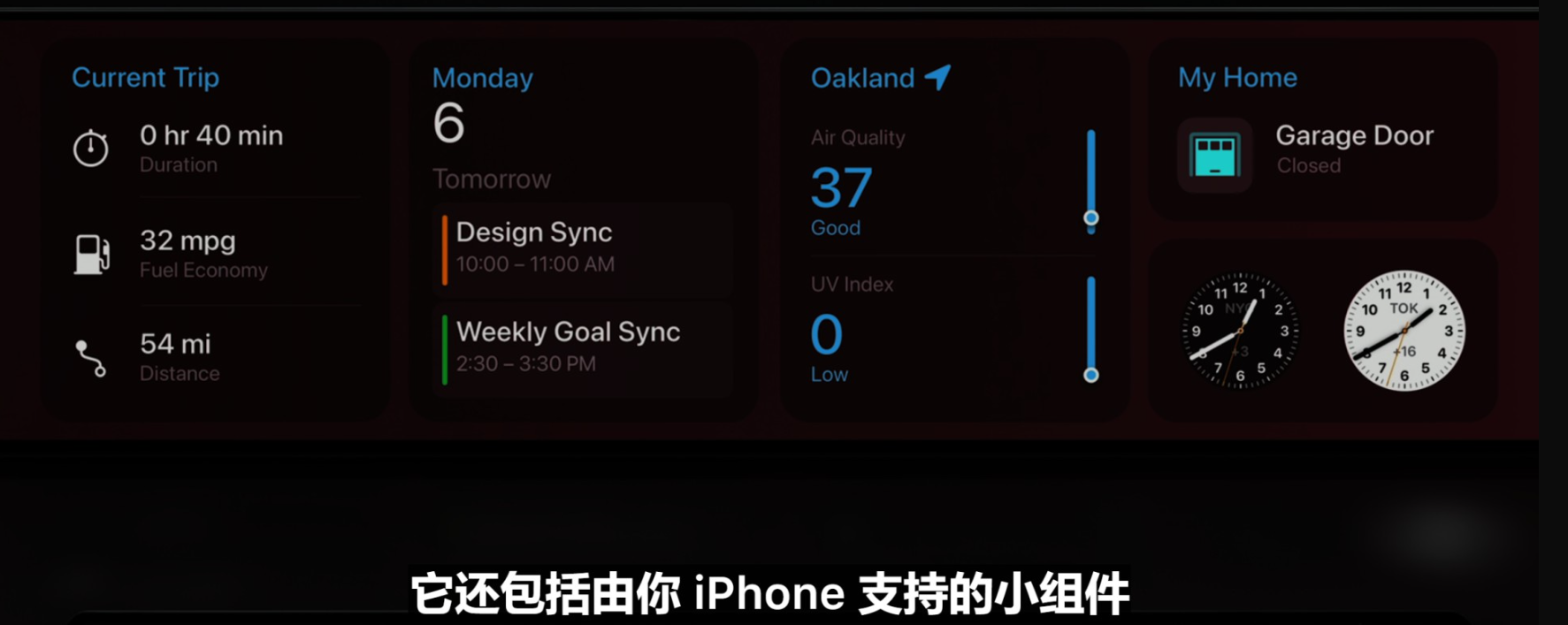 1. 适配更多屏幕(仪表盘、信息娱乐屏),更多屏幕形式(一体屏、分离式、横屏、竖屏) 2. 增加小组件功能 3. 直接通过CarPlay控制车辆的一些设置:收音机、空调、座椅加热/通风;无缝显示行驶速度、燃油余量、车内温度及更多的仪表信息。"
