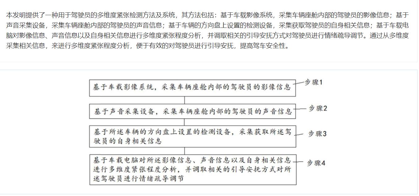 基于车载影像系统,采集车辆座舱内部的驾驶员的影像信息;基于声音采集设备,采集车辆座舱内部的驾驶员的声音信息;基于车辆的方向盘上设置的检测设备,采集获取驾驶员的自身相关信息;基于车载电脑对影像信息、声音信息以及自身相关信息进行多维度紧张程度分析,并调取相关的引导安抚方式对驾驶员进行情绪疏导调节。通过从多维度采集相关信息,来进行多维度紧张程度分析,便于有效的对驾驶员进行引导安抚,提高驾车安全性。