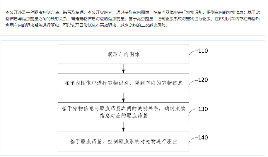 在车内图像中进行宠物识别,得到车内的宠物信息;基于宠物信息与驱虫药量之间的映射关系,确定宠物信息对应的驱虫药量;基于驱虫药量,控制驱虫系统对宠物进行驱虫,在识别到车内存在宠物后利用车内的驱虫系统进行驱虫,可以实现日常低成本高效驱虫,减少宠物的二次感染风险。