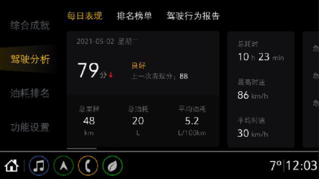 驾车行为分析:小雪OS能时刻记录和分析车主的驾驶行为和油耗数据,并与其他车友做对比,找到差距和可提升的空间。驾驶行为评价对于提升车主的行车安全非常有帮助。记录危险的驾驶操作,比如油耗数据、急加速、急刹车、不打灯并线、注意力不集中、超速行驶等。